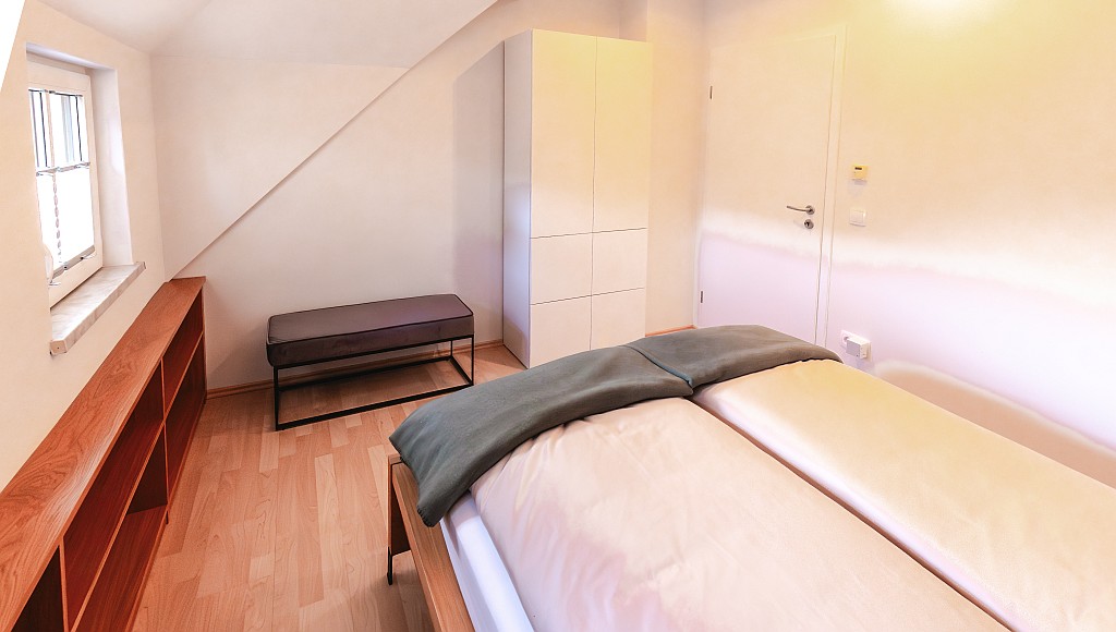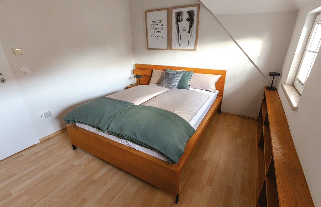 Das Schlafzimmer ist mit einem Doppelbett (1,4 x 2 m) ausgestattet.