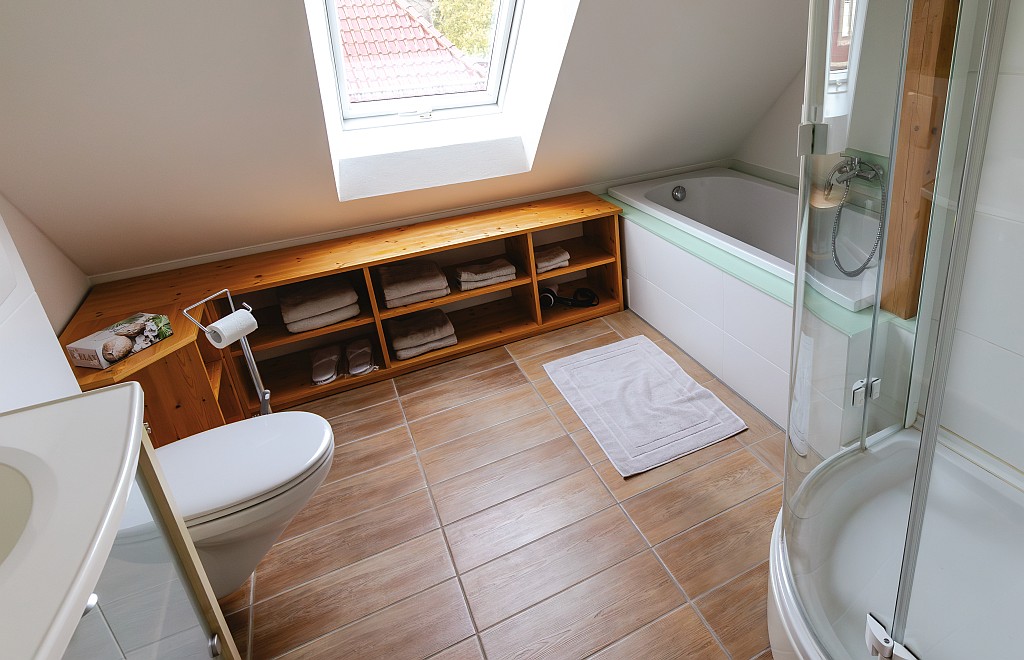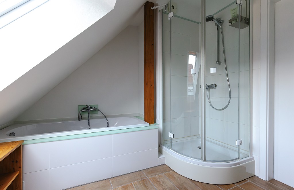 Das Tageslicht-Badezimmer verfügt über WC, Waschtisch, Badewanne und Dusche.Ein Haartrockner ist vorhanden.