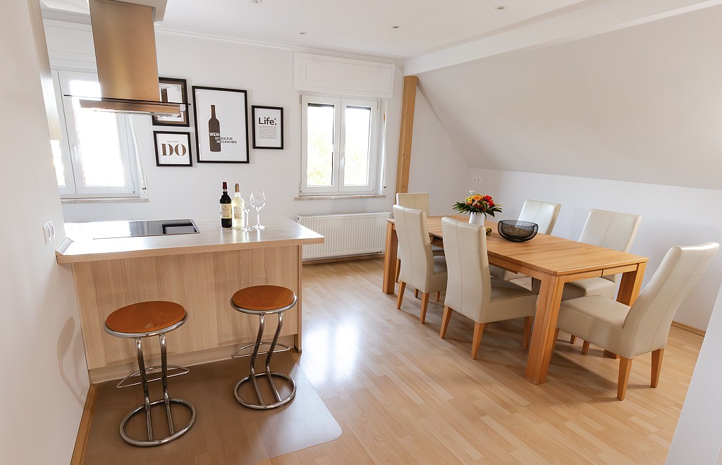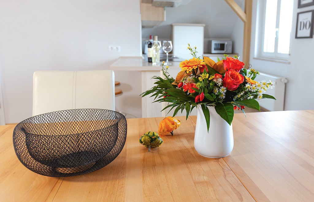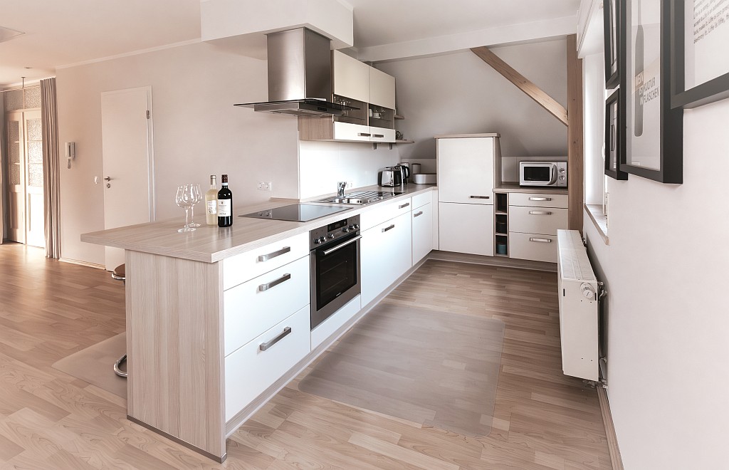 Die vollausgestattete Küche mit Esstisch verfügt über Backofen, Induktionsfeld, Kühlschrank mit Eisfach, Geschirrspüler, Mikrowelle, Toaster, Wasserkocher, Kaffeedrücker, Teeautomat u.v.m.