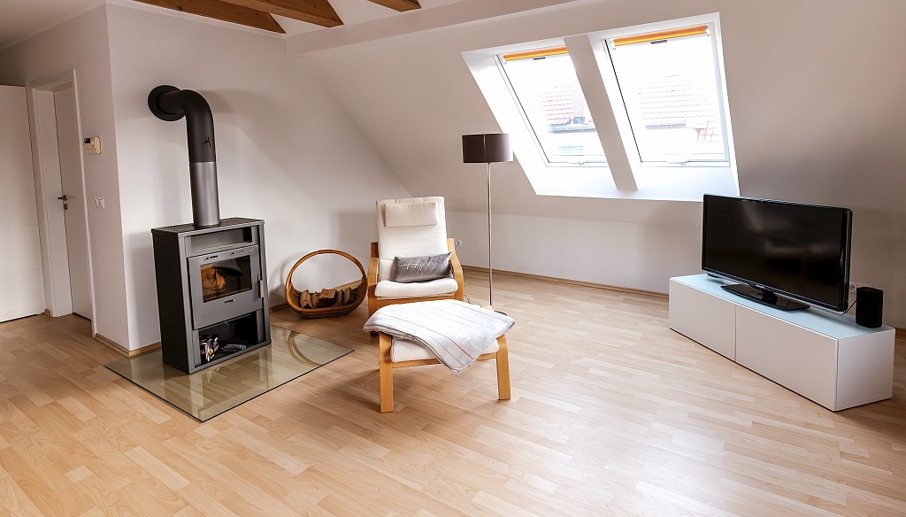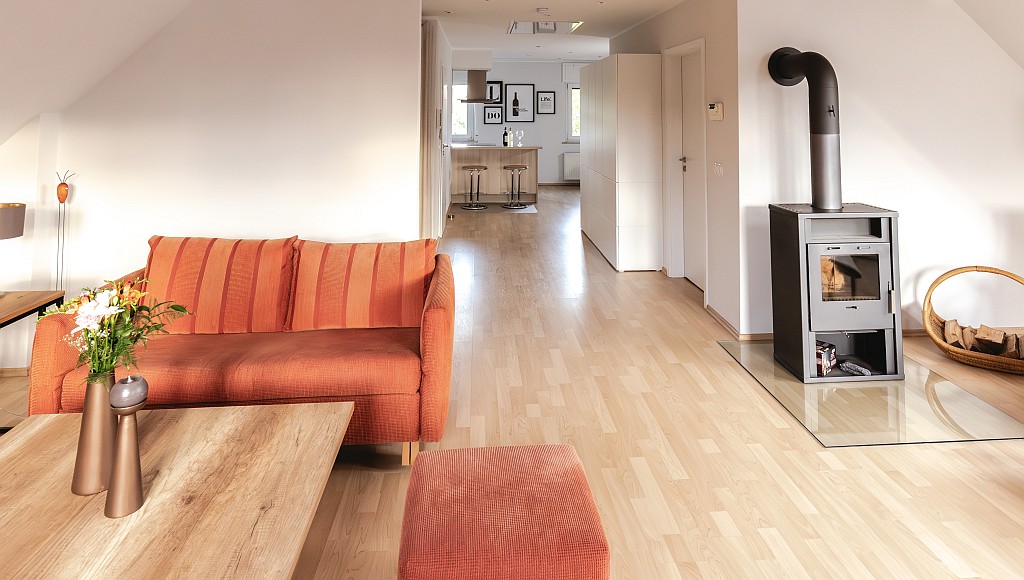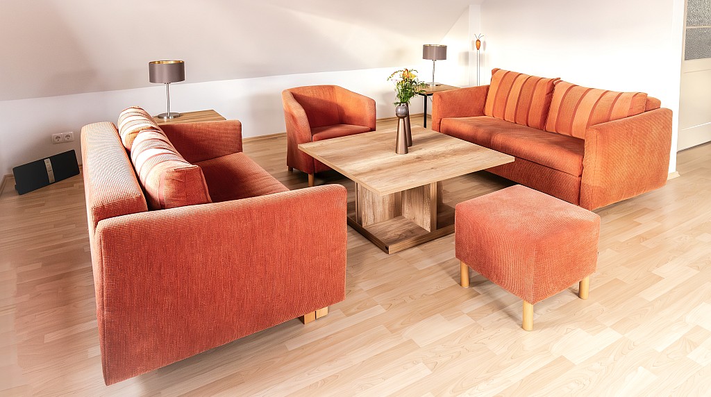 Im Wohnzimmer befindet sich eine Sitzgruppe mit zwei Doppelsitzer-Couches, Sessel und Hocker. Beide Couches sind umwandelbar (1,4 x 2 m) für die 3. oder 4. Person. Neben dem holzbefeuerten Kamin lädt ein Schwingsessel zum Lesen ein.